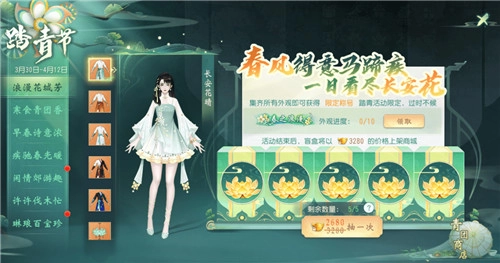 既然是踏青节活动,自然少不了浪漫外观的点缀~踏春节期间,各位少侠可以参与外观盲盒抽奖活动,为自己换上全新的春日浪漫外观,是时候考验人品啦,快来试试你的运气如何吧!另外,全新的霓裳幻境也已上线,换上新衣悠然自得地漫步春光里,以绚丽装扮欣赏长安城的美景,这该是多么惬意的事呀。