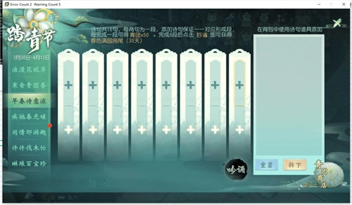 一提起清明节,脑海里总会跳出“清明时节雨纷纷,路上行人欲断魂”“燕子来时新社,梨花落后清明”这类经典诗句。无双也为热爱吟诗的侠士们筹备了咏春对诗活动:参与的玩家只需把16句诗句两两配对填入活动界面,只要对诗正确,就能收获一份春日好礼——30天期限的“清明拖尾·春色满园”;要是已经拥有这款拖尾,还能把它拆解成100时装代金券呢!这场缤纷活动福利满满,不管是换上新拖尾还是兑换代金券,都能让你靓出彩~