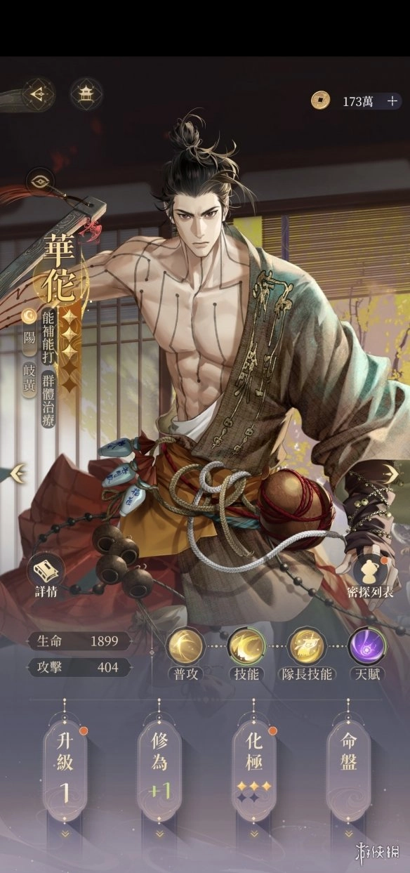 5、华佗的星级自然是越高越理想,不过他的天赋并非必需,二星仅仅是增加15%的攻击力和回血效果。只要搭配满足上述条件,即便一星华佗无法打出20000的群体伤害,但60级修为加9的情况下,一万左右的伤害还是能达到的。