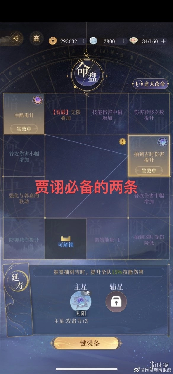 4、贾诩的毒计技能必须点满,50%的技能伤害加成让他成为能一波秒人的核心角色,不仅和郭嘉配合默契,和其他任何技能型武将搭配效果都很出色。