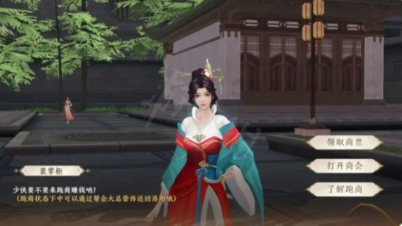 若想进行跑商活动,记得提前向帮会管理人员申请商人身份,之后回到帮派属地的裴掌柜那里就能领取跑商任务了。