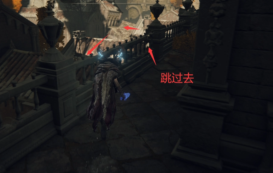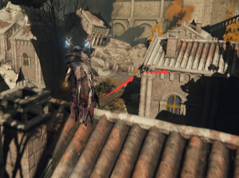来到左边的小路,跳过栏杆来到下面的屋顶上。