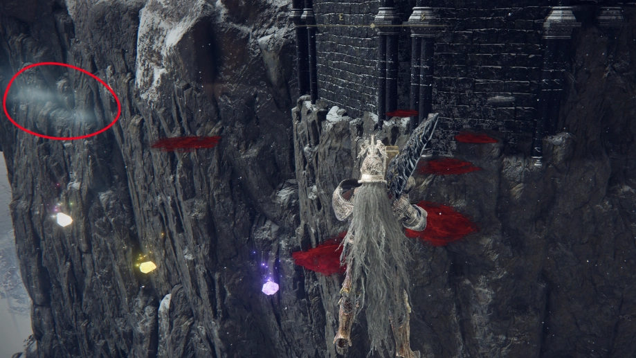 这时我们得往回走一段路,把视角调整妥当,以黑色的山壁为背景,能隐约看到一缕蓝色雾气在空中飘荡,这便是第二条无形的桥。不得不赞叹这隐形桥与桥中藏桥的大胆设计,确实精准击中了喜爱西幻魔法题材玩家的兴奋点。要是担心找不到向上的入口,也可以查看背包里是否还有之前探索时捡到的七彩石。使用它后,角色会往地上扔一块发光的石头,若那个位置可以站立,石头就会悬浮在空中;反之,它会从高处落下并发出巨大声响。像这样的隐形道路以及反复用七彩石投石问路的设定,也是魂系列的经典桥段。