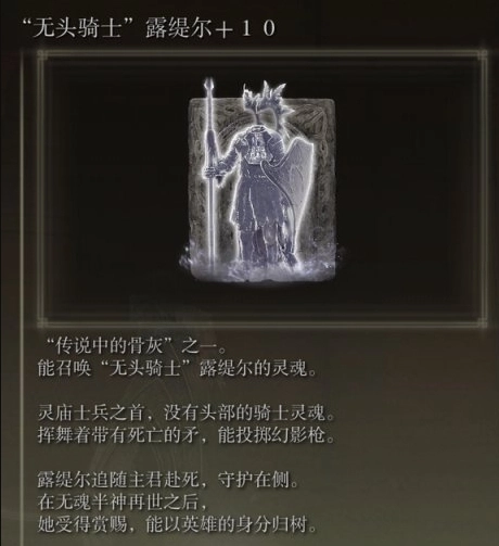 在《艾尔登法环》里,无头骑士露缇尔属于橙色骨灰,玩家得挑战地下墓地并击败那里的BOSS才能获取它。由于这个墓地在游戏早期就可以到达,所以露缇尔也成了萌新们早期开荒时的得力助手。