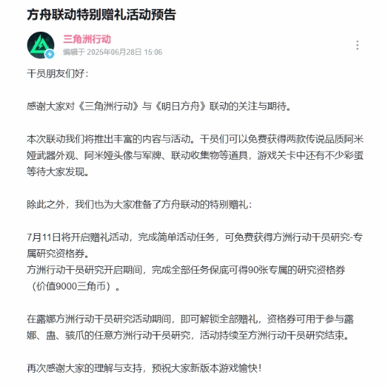 7月11日赠礼活动即将开启,完成简单的活动任务,就能免费获取《方洲行动》干员研究的专属研究资格券。