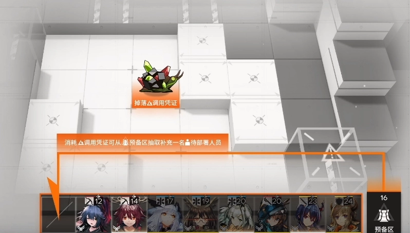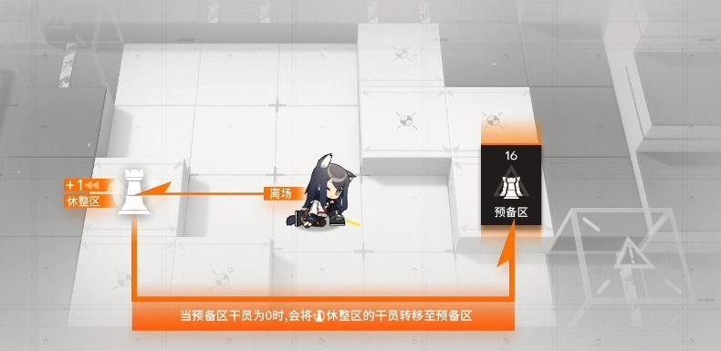区域分为待部署区、预备区与休整区。玩家可消耗调用凭证,从预备区补充一名待部署人员。离场的干员将进入休整区;当预备区的干员数量为0时,休整区的干员会被转移至预备区。