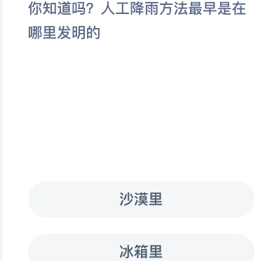 本次给大家带来的是蚂蚁庄园8月2日的庄园小课堂问题,这个小问题围绕人工降雨的起源展开——人工降雨是人们在一次机缘巧合中发明的,那么它的最早发现地点是哪里呢?