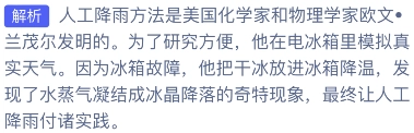 解析:人工降雨的方法由美国化学家和物理学家欧文·兰茂尔发明。为便于研究,他在电冰箱中模拟真实天气状况。由于冰箱出现故障,他将干冰放入冰箱内降温,意外发现水蒸气凝结成冰晶并降落的奇特现象,这一发现最终使人工降雨得以付诸实践。