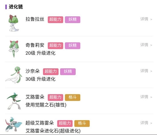 进化链:拉鲁拉丝进化为奇鲁莉安,奇鲁莉安进化为沙奈朵,沙奈朵进化为艾露雷朵,艾露雷朵可进一步进化为超级艾露雷朵