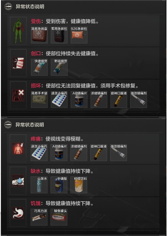 受伤状态下可使用的急救物品包括:简易急救盒、军用急救包、926急救包。