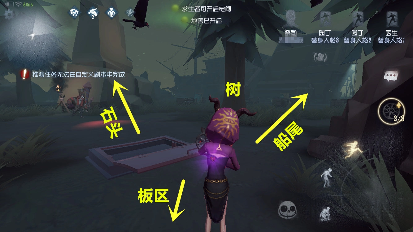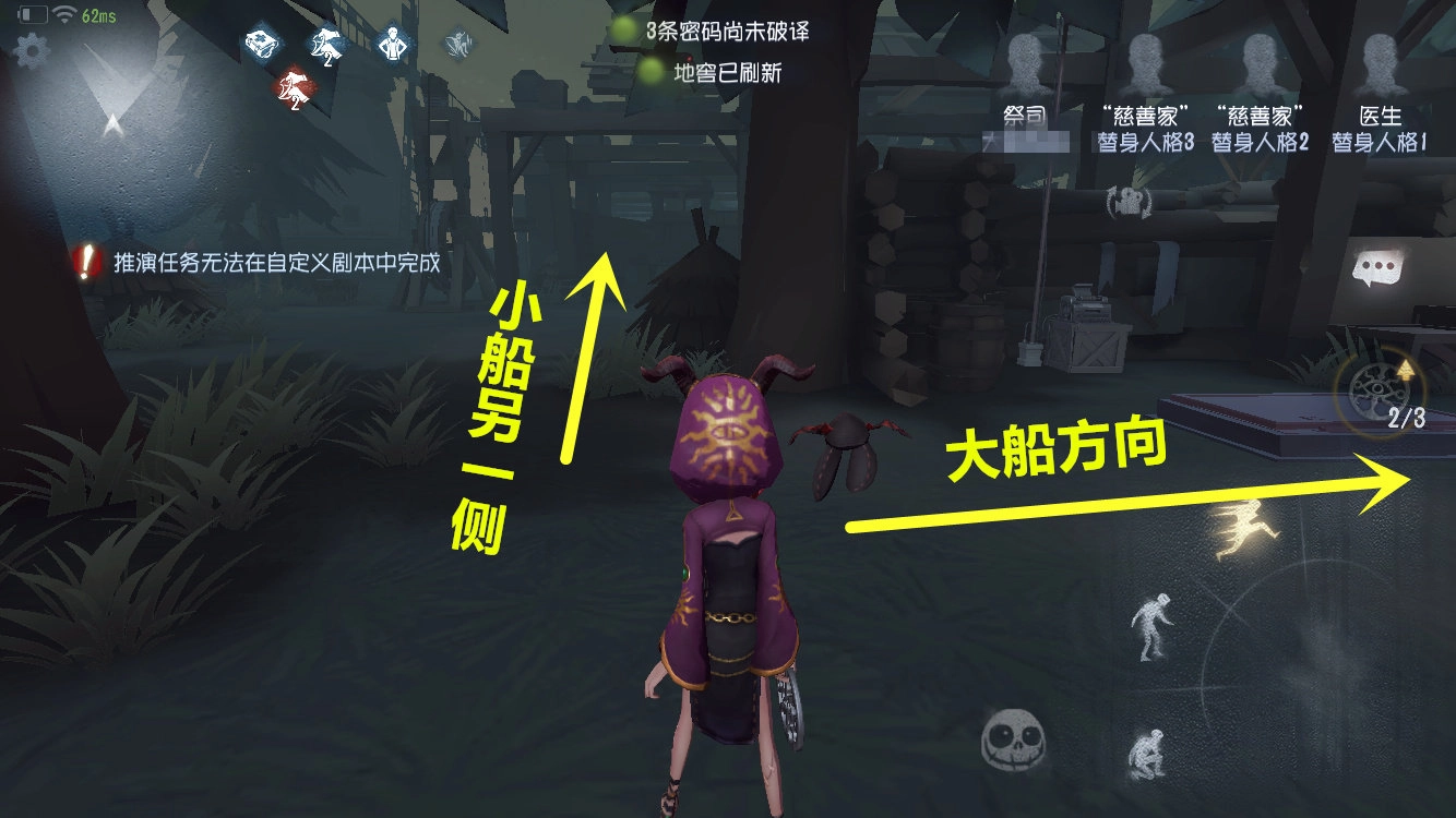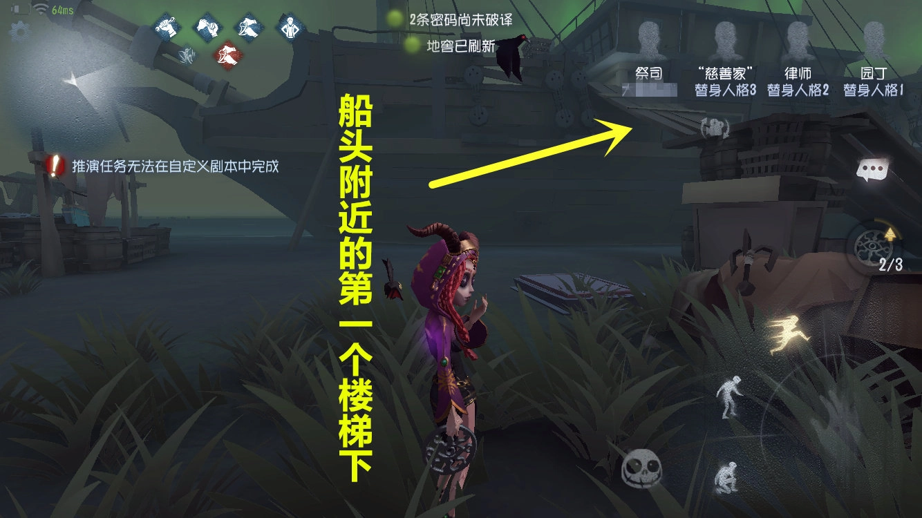 大船船头下方有一台密码机和板区,地窖位于靠近山体的那一侧。