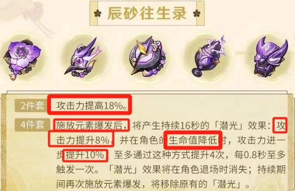 2、辰砂四件套不仅可以提升自身伤害,而且自身血量越低,造成的伤害就越高。