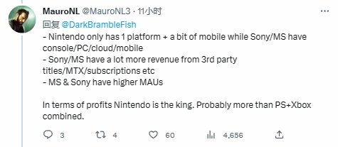 @MauroNL3还提到,与索尼、微软相比,任天堂坚持的单平台策略在一定程度上制约了其营收的增长空间。索尼和微软不仅拥有更多的月活跃用户,还能从第三方游戏的销售以及订阅服务中获取可观的分成收入。