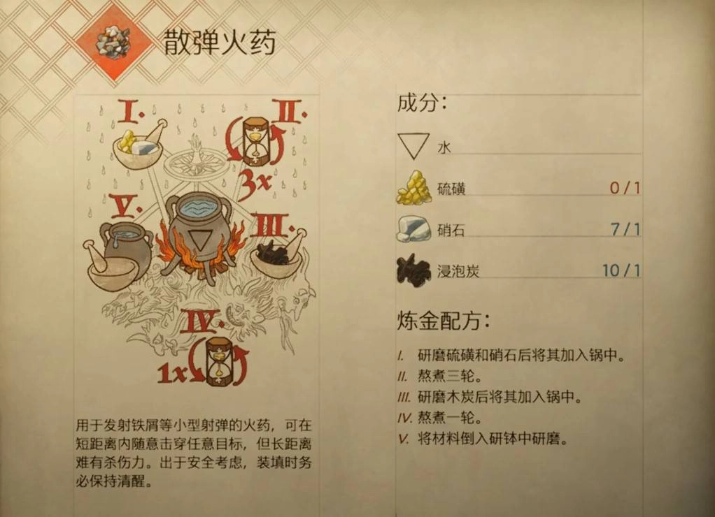 下面为大家介绍《天国拯救2》里散弹火药的配方,在游戏里通过炼金系统,并且严格按照配方操作,就能制作出对应的物品。