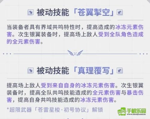 被动技能「苍翼掣空」的效果为:当装备者拥有界域共鸣特性时,冰冻伤害会得到提升;而当次生银翼装备该技能时,场上敌人受到全队各类元素伤害的数值均会提高。另一被动技能「真理覆写」则能增强敌人受到的自身冰冻伤害,若由次生银翼装备,不仅全队共鸣技能的全元素伤害与暴击伤害会有所提升,自身共鸣技能的冰冻伤害还能获得额外增幅。这两个被动技能叠加使用,能带来较为显著的输出提升效果。