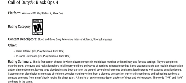 《使命召唤15:黑色行动4》明显不适合儿童玩。今天这款游戏的ESRB评级已经公布,被评定为“M”级(17岁以下禁止)。ESRB指出《使命召唤15》存在“极度血腥、毒品暗示、非常暴力以及脏话内容”,显然不适合未成年人。此外,评级信息还透露了游戏的一些细节,例如游戏内包含内购机制。