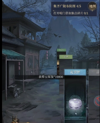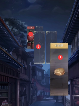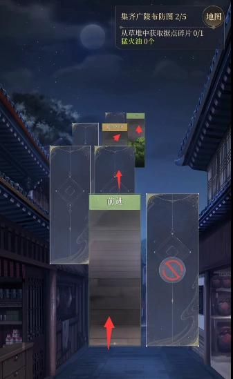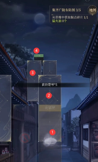 5、依照下图所示的顺序逐个点击卡牌,在草堆处能够获取花银匣,打开它就能得到第三份广陵布防图,接着进入小巷。