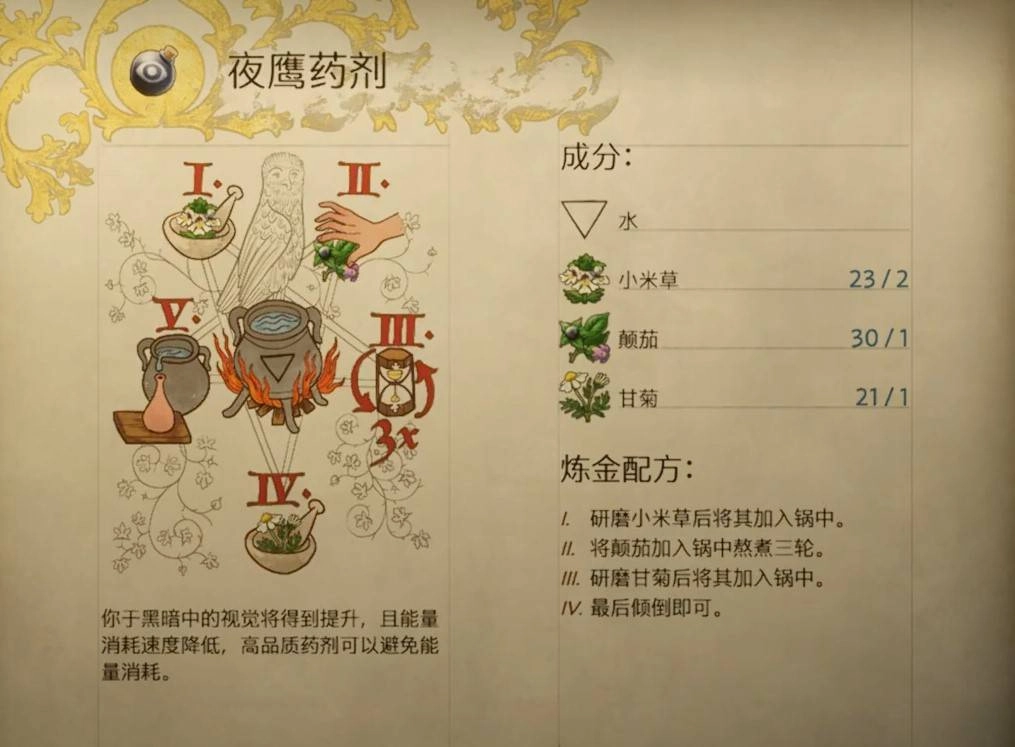 下面为大家介绍天国拯救2里夜鹰药剂的配方,在游戏里运用炼金系统并严格按照配方操作,就能制作出对应的物品。