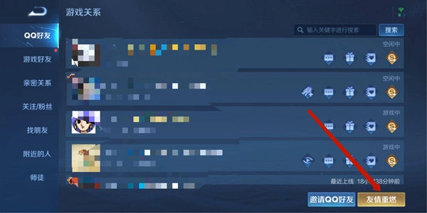 3、进入游戏关系页面后,点击右下角的“友情重燃”按钮。
