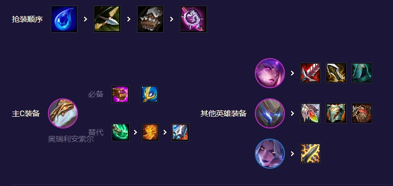 莫甘娜的装备只出一件电刀就够了,不用再多出;龙王的出装要堆法强;卑尔维斯虽然吃物理输出,但不用做轻语这件装备,毕竟有莫甘娜辅助提供减抗效果;盖伦则是要出纯肉装。