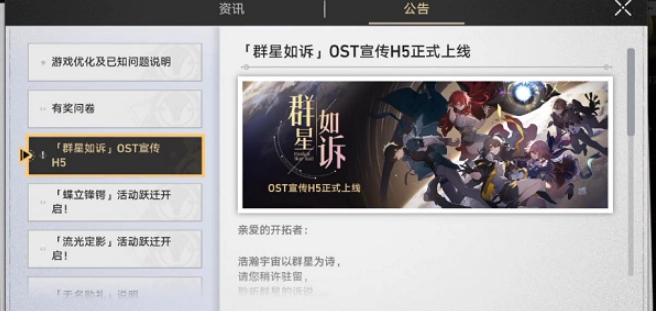 打开游戏后,先点击左上角的“手机”按钮,接着在右侧找到并点击“资讯/公告”板块,然后在公告列表里选择“群星如诉OST宣传H5”,最后从该公告的最下方点击H5地址(即上方的活动地址入口),即可跳转到手机QQ音乐app参与活动。