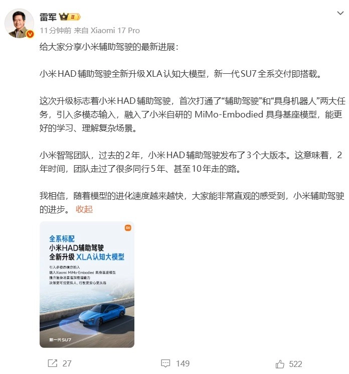 随着新一代小米SU7的发布日益临近,小米最新一代辅助驾驶系统也即将完成升级。今日,雷军通过微博分享了小米辅助驾驶的最新动态。他透露,小米HAD辅助驾驶已全新升级至XLA认知大模型,而新一代SU7全系车型在交付时都将搭载这一系统。