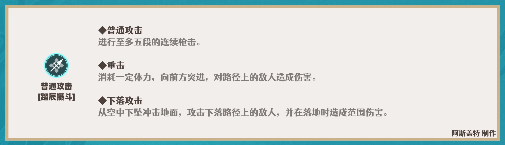 ①.普通攻击共5段6次伤害,其中第4段造成2次伤害,其余段数均造成1次伤害。