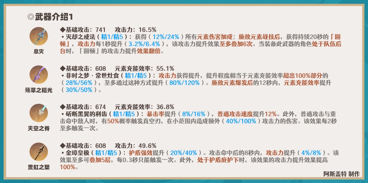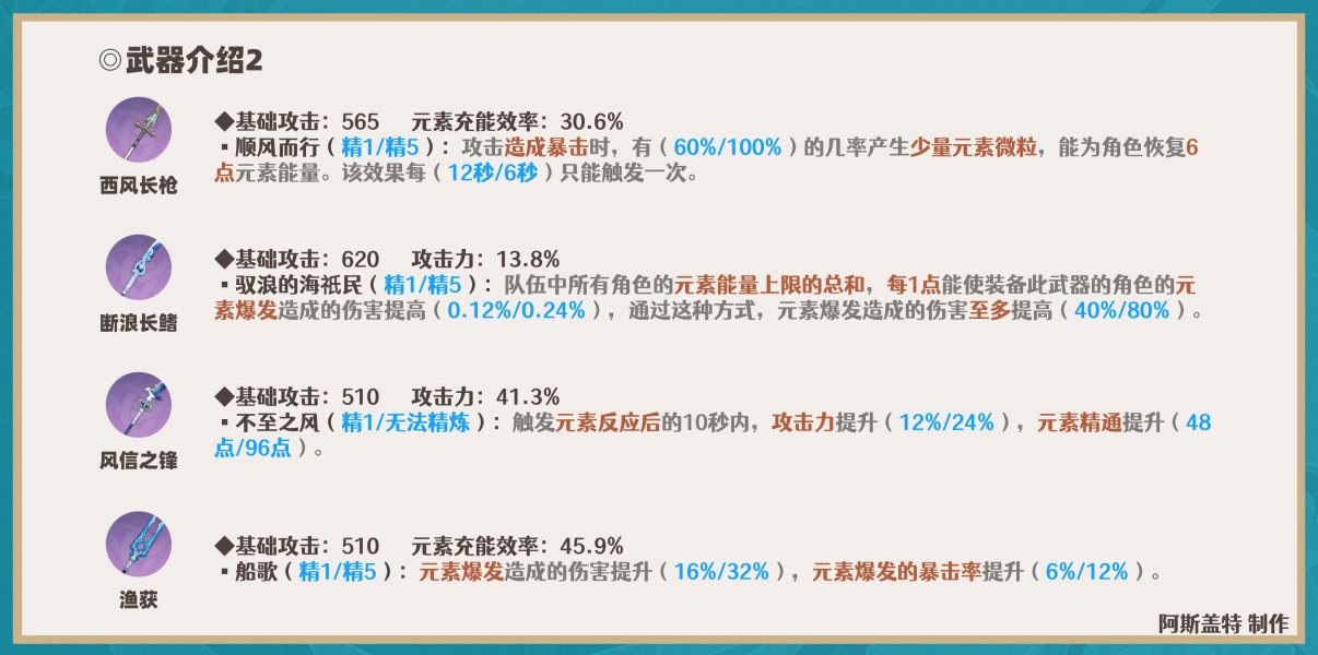有效副词条:元素充能效率≥百分比攻击>暴击率(西风长枪)>其他