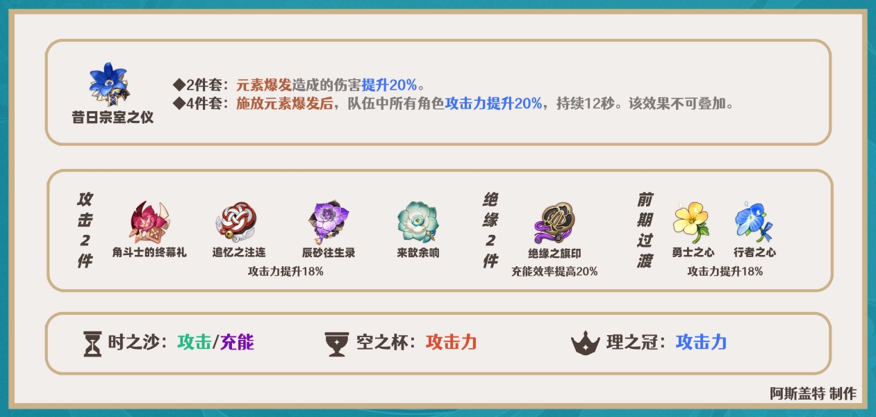 ②.若想兼具元素爆发的施放,则推荐优先考虑充能沙漏,或副词条堆叠元素充能效率,推荐在200%以上(0命)。