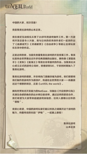 在集英社游戏担任开发统筹的提到,集英社游戏的目标并非把热门漫画改成游戏,而是想让自己制作的游戏成为原创IP,传递给全球玩家。《unVEIL the world》正是这一目标的最好体现。通过和网易的密切合作,集英社希望能为各位充满热血的少年少女们带来超越游戏体验、让所有人都难以忘记的「冒险」。这种合作不仅显示出集英社对原创游戏IP的重视,也表达了其与中国顶尖游戏开发公司合作的期待,更代表着集英社对少年冒险精神的传承与守护。