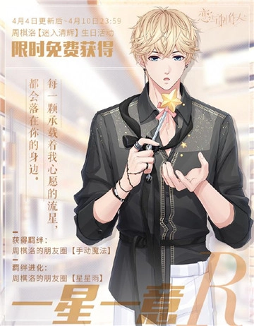 活动进入第二阶段后,玩家可以向周棋洛送上祝福,在他生日当天,此前写下的祝福会得到他的回应。另外,生日当天进入活动界面,还能解锁他的生日惊喜祝愿剧情。