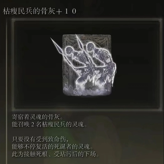 在《艾尔登法环》里,枯瘦民兵的骨灰是通过击败地图上的精英Boss才能获取的道具。这个骨灰的伤害能力不算突出,不过它的持续作战能力很强——只要没有遭受致命伤害,就会持续复活,和我们平时遇到的骷髅兵有点像,要是没能及时清除它死亡后留下的光点,就会一直复生。