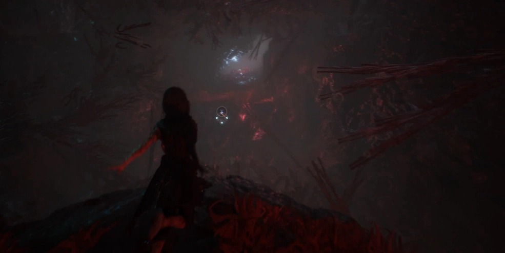继续向前行进,路上把遇到的怪物清理掉,到达下方的这个裂缝处后,往边缘靠近一些,会出现钩索提示,借助钩索就能到达对面。