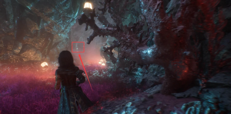 继续往前,再经过两个钩索就能到达下图所示的位置,这里已经没有路了。此时你需要抬头看向山壁,借助山壁上的借力点攀爬上去。