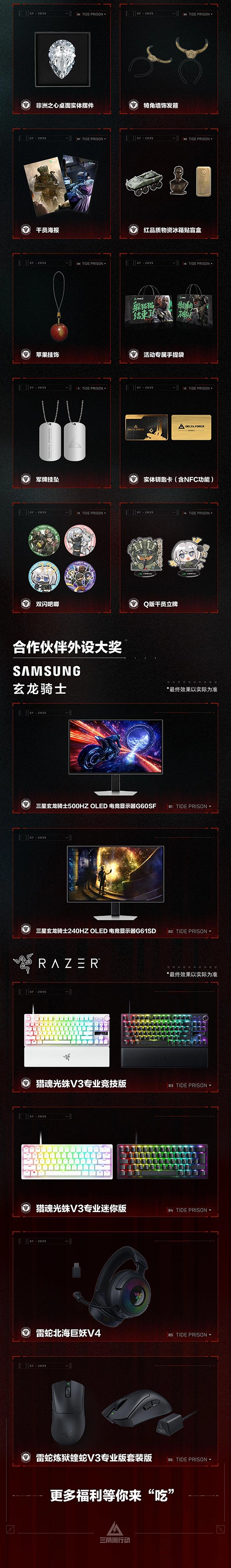 参与BW2025《三角洲行动》展台的「破壁」行动,完成展台打卡、支线任务等,均有机会实现线下“百万”撤离!本次行动战利品包含黑鹰坠落典藏版实体礼盒、战术“大红包”、曼德尔砖款实体充电宝、鼠标垫、非洲之心桌面实体摆件等。此外还有合作伙伴外设大奖,干员们有机会抽取到SAMSUNG玄龙骑士500HZ OLED 电竞显示器G60SF、三星玄龙骑士240HZ LED 电竞显示器G61SD等更多福利等你来“吃”。
