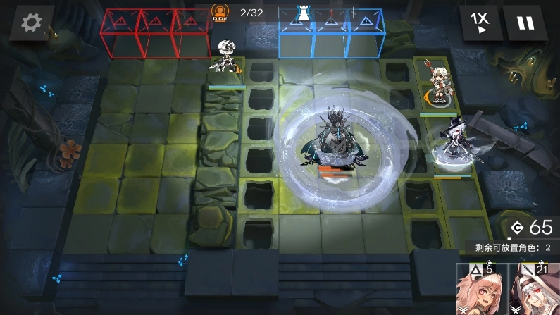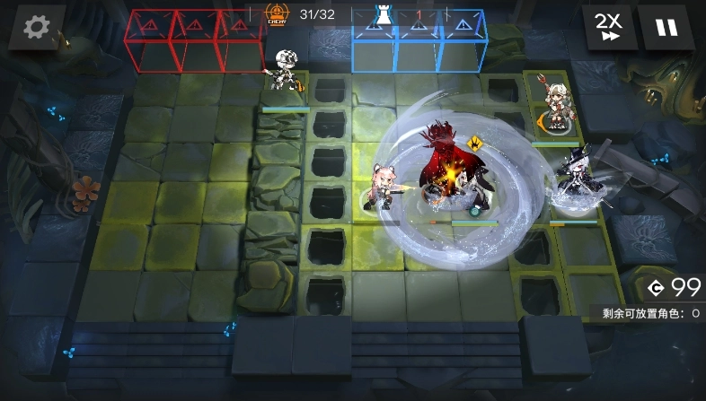 然后就开始等着左边的怪物排好队,等它们排完就会一起走过来,等最前面的小怪走到boss上方那格时释放技能,就能直接把小怪全清掉了。