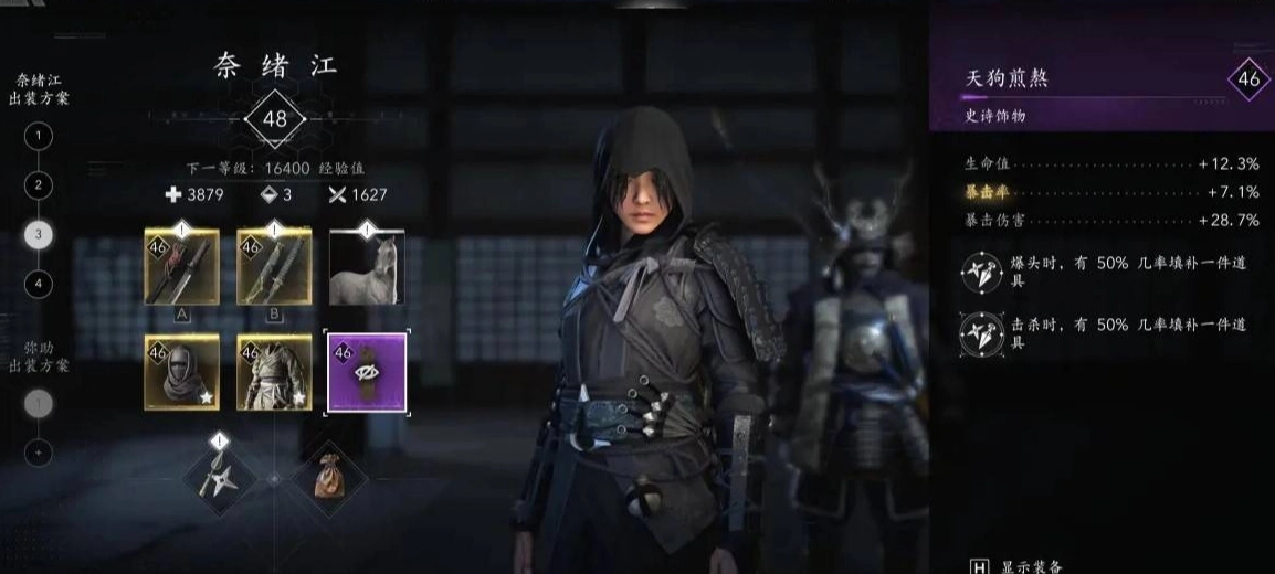 这篇给大家介绍《刺客信条:影》里奈绪江的无限飞刀流搭配,该流派的核心在于帽子、轻甲和饰品,特别是得有一个紫色饰品。