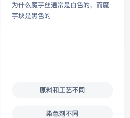 本次要和大家分享的是蚂蚁庄园8月16日的庄园小课堂问题,这次的问题围绕我们日常食用的魔芋展开——魔芋的口感十分美味,不过魔芋丝与魔芋块的颜色存在差异,这究竟是怎么回事呢?