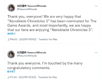 在今日凌晨的北京时间,TGA正式揭晓了2022年度各奖项的提名名单。任天堂旗下的第一方JRPG力作《异度神剑3》成功入围三项大奖,分别是TGA 2022的「年度游戏」「最佳配乐/音乐」以及「最佳角色扮演游戏」。对此,该游戏的音乐制作人光田康典也向广大粉丝表达了感谢之情。
