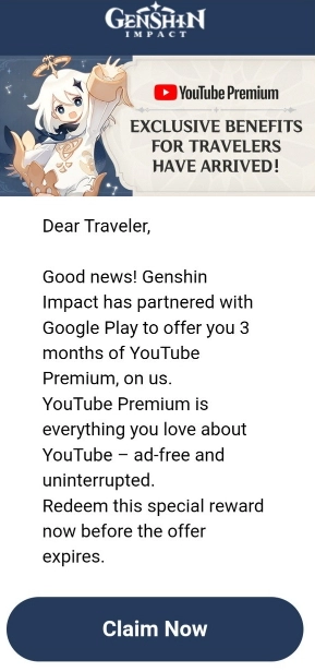 近日,《原神》海外官网发布消息称,HoYoverse与Google Play展开合作,为玩家提供为期3个月的YouTube Premium(油管会员)免费试用服务。YouTube Premium前身为YouTube Red,其服务内容包括观看体验、与众多内容创作者联合打造的优质YouTube原创内容,以及YouTube音乐等。
