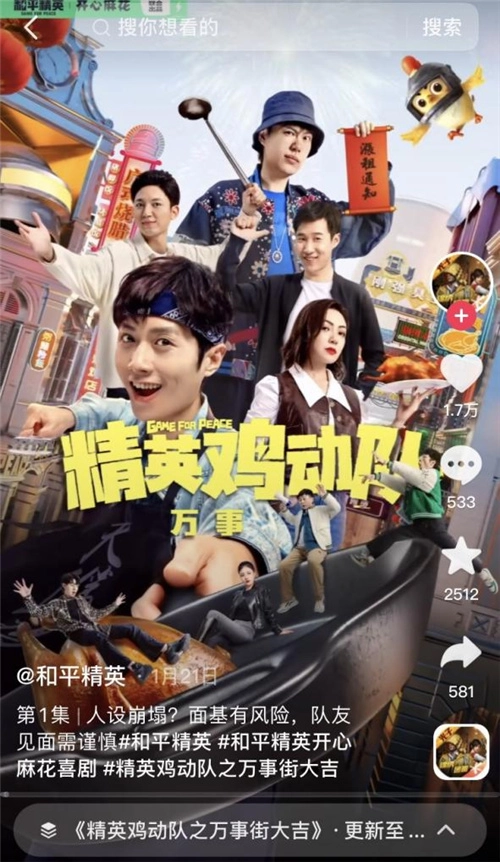 此外,《和平精英》也紧跟短视频平台潮流,不仅与抖音生活类 KOL 展开合作,在春节生活场景中诠释「吃鸡」之乐,还联手开心麻花制作《精英鸡动队之万事街大吉》短剧,竖屏形态的短剧高度适配短视频平台,在抖音、快手迅速锁定用户注意力。