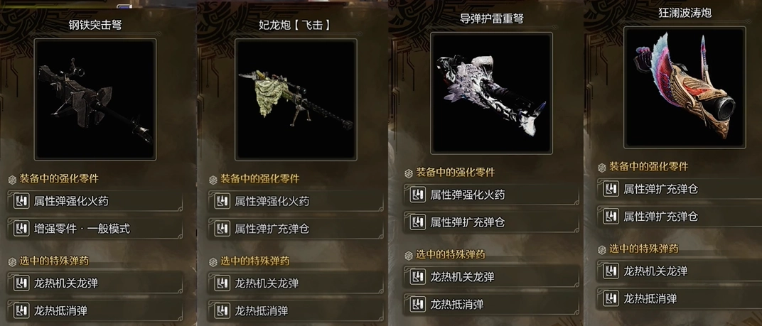 在素材武器的选择上,冰属性搭配钢铁弩,火属性选用女王弩,雷属性适配雷厄弩,水属性则搭配狂澜弩。