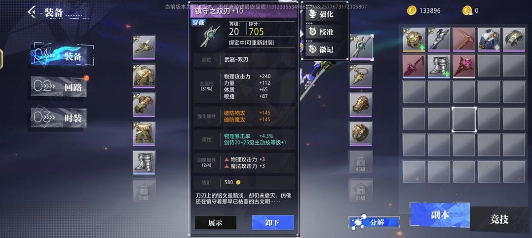 我们以图中的“镇守之双剑”为例,能看到其面板包含多种属性信息,像部位说明、主属性、强化属性、装备属性、回路属性等;另外,要是防具的话,还会额外有防具精通和套装属性。