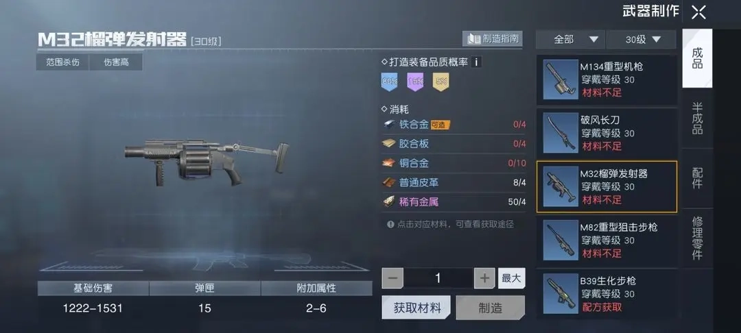 幸存者们在购买并使用图纸配方后,就能借助装备制作台来制作重武器了。重武器的制作规则和轻型武器是相同的,不过在材料消耗上会更高昂。要是幸存者们没有足够的材料去制作重武器,还可以在【集市】—【装备商店】—【基础装备】里购买到绿色品质的M134重型机枪。