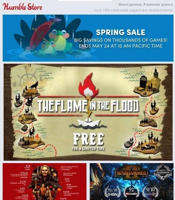 今天Humble抢先于STEAM开启了春季游戏特卖,平台上数千款游戏均有折扣优惠。尽管Humble商城的游戏定价未针对国区适配,整体价格通常比STEAM高,但本次春季特卖带来了福利——免费游戏《洪潮之焰》。