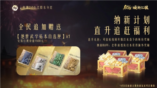 在“射雕上线工作汇报”直播活动里,《射雕》项目组把所有玩家都当作“初始股东”,并隆重推出了“首次股东分红”福利活动。这次的系列福利不仅覆盖范围广泛,而且福利价值很高,主要包含三个核心部分:第一,全民月卡福利让大家共同庆祝,在4月3日之前注册游戏的玩家都能免费领取为期90天的月卡;第二,向玩家发放价值1500元的绝世武学自选匣,助力大家轻松快速提升自身战力;第三,推出“进度直升礼包”,帮助新注册的账号毫无压力地跟上老玩家的进度。