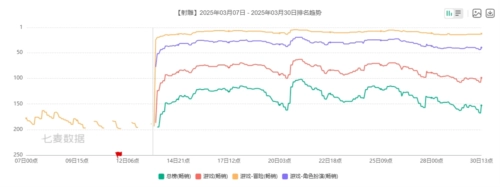 3月13日《射雕》2.0 版本上线后,iOS 免费榜与畅销榜数据均呈现显著上升趋势。游戏当天即重返免费榜Top100行列,并进入榜单中上游区间;畅销榜方面,开服首日便实现排名快速攀升,随后保持稳定增长态势。