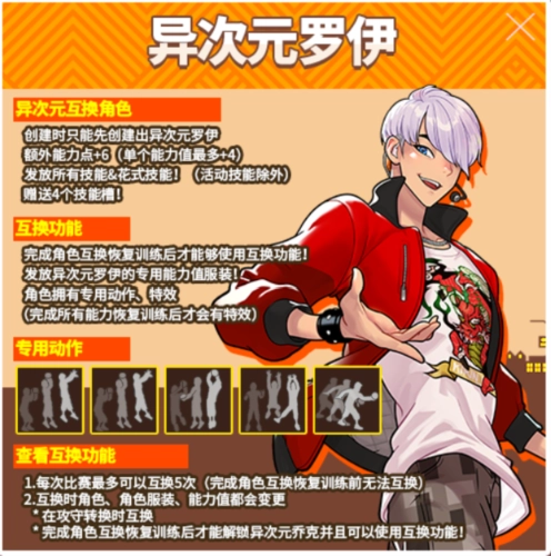 异次元角色互换玩法:创建角色时,需先创建异次元罗伊,该角色额外获得6点能力点(单个能力值最多可加4点),同时解锁所有技能及花式技能(活动技能不在此列),并附赠4个技能槽!