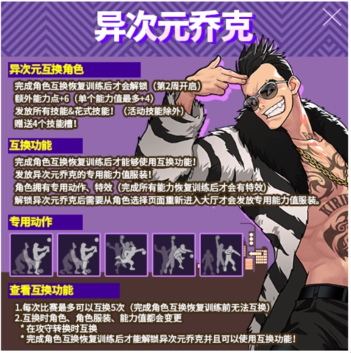 互换功能的使用条件是完成角色互换恢复训练;异次元罗伊的专用能力值服装会进行发放;该角色具备专用动作与特效,其中特效需在完成所有能力恢复训练后才能解锁。