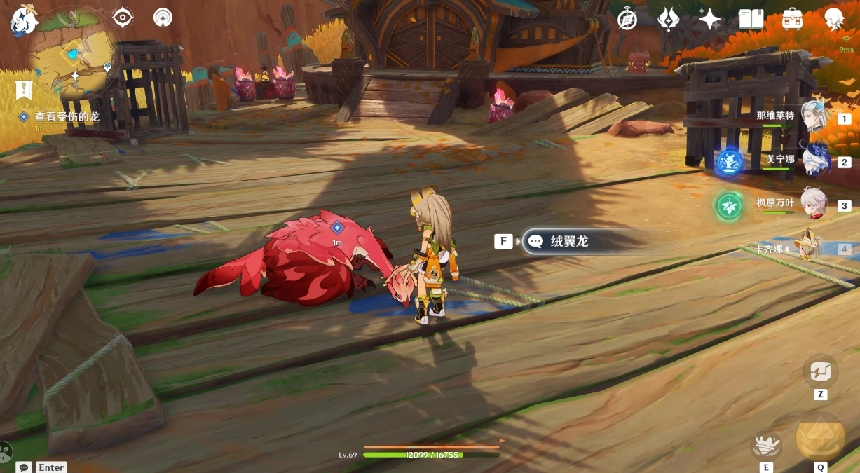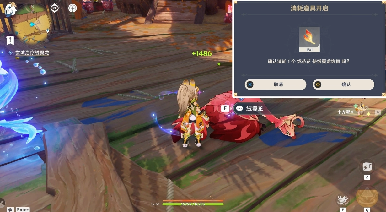 收集完这两朵之后,需要靠近小龙触发对话来推进任务。